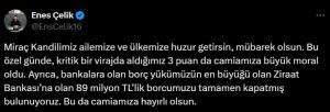 Başkan Çelik, Miraç Kandili dolayısıyla da sosyal medya hesabından yaptığı paylaşımda, kulübün borçlarına yönelik önemli bir haberi de duyurdu.