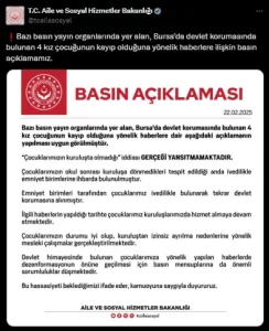Aile ve Sosyal Hizmetler Bakanlığı, Bursa’da 4 kız çocuğunun kaldıkları yurttan kaçtıkları ve kayıp olduklarına yönelik yapılan haberlere dair açıklama yaptı.