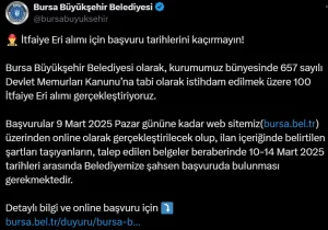 Adaylar, başvurularını Büyükşehir Belediyesi‘nin resmi web sitesi olan bursa.bel.tr üzerinden online olarak gerçekleştirebilecekler. İlanda belirtilen şartları taşıyan adayların, gerekli belgelerle birlikte 10-14 Mart 2025 tarihleri arasında belediyeye şahsen başvuruda bulunmaları gerekiyor.