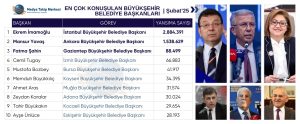 MTM Medya Takip Merkezi’nin internet, sosyal medya, televizyon ve yazılı basını kapsayan 10 bini aşkın kaynak üzerinden yaptığı araştırmaya göre, Şubat 2025, belediye başkanlarının projeleri, kararları ve siyasi açıklamalarıyla geniş yankı uyandırdığı bir ay oldu. Özellikle ulaşım, su yönetimi, kentsel dönüşüm ve altyapı projeleri vatandaşların günlük yaşamına doğrudan etki eden konular olarak öne çıktı. Söz konusu dönemde birinci sırada Ekrem İmamoğlu, ikinci sırada Mansur Yavaş yer alırken, Bursa Büyükşehir Belediye Başkanı Mustafa Bozbey 41 bin 917 kez konuşularak beşinci sırada yer aldı. Başkan Bozbey, özellikle ulaşım projeleri ve kentsel dönüşüm planlarıyla gündeme geldi. Başkan Bozbey’in duyurduğu projeler olumlu karşılandı.