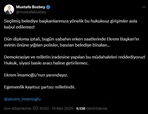 Başkan Mustafa Bozbey, sosyal medya hesabından, “Seçilmiş belediye başkanlarımıza yönelik bu hukuksuz girişimler asla kabul edilemez!” ifadelerini kullandı.